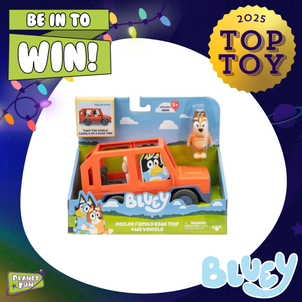 To celebrate our Top Toys of 2025 we're giving you the chance to WIN them! This giveaway is for the Bluey Heeler Family Road Trip 4WD Vehicle 🩵